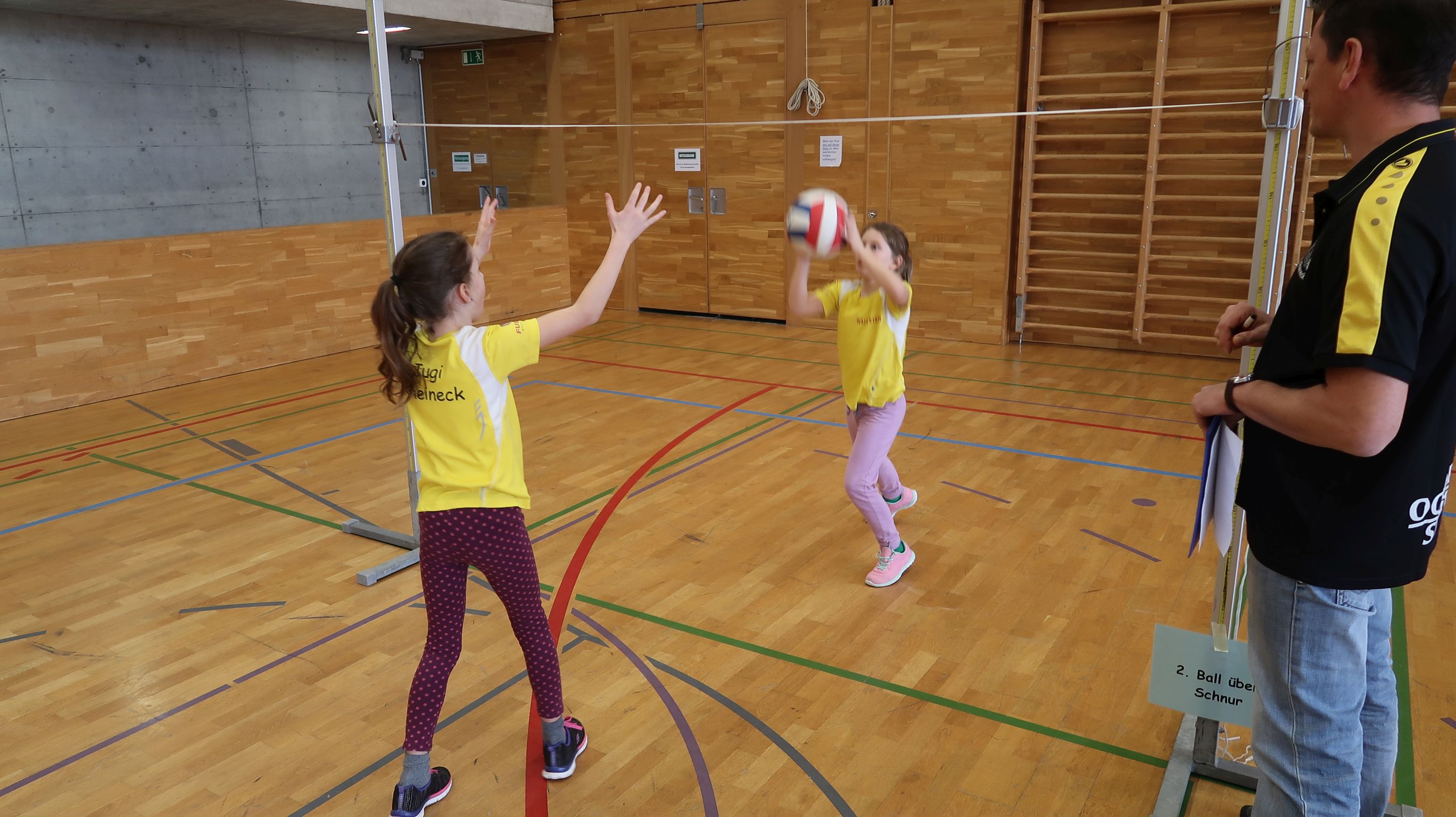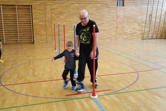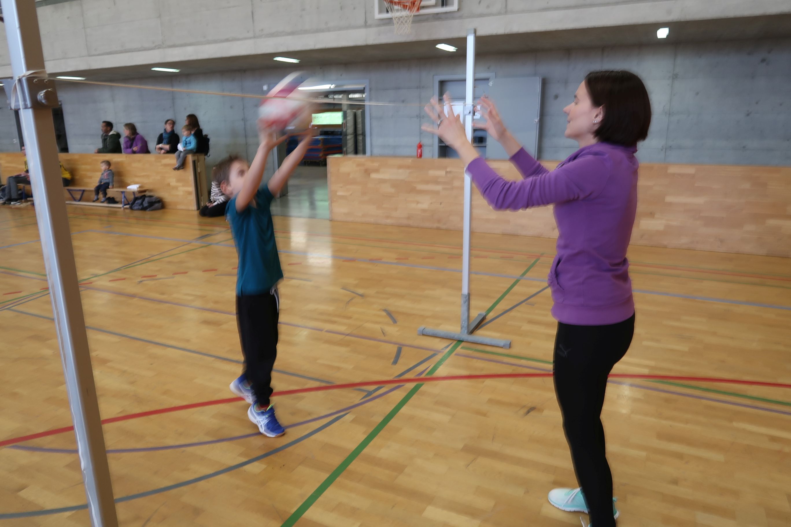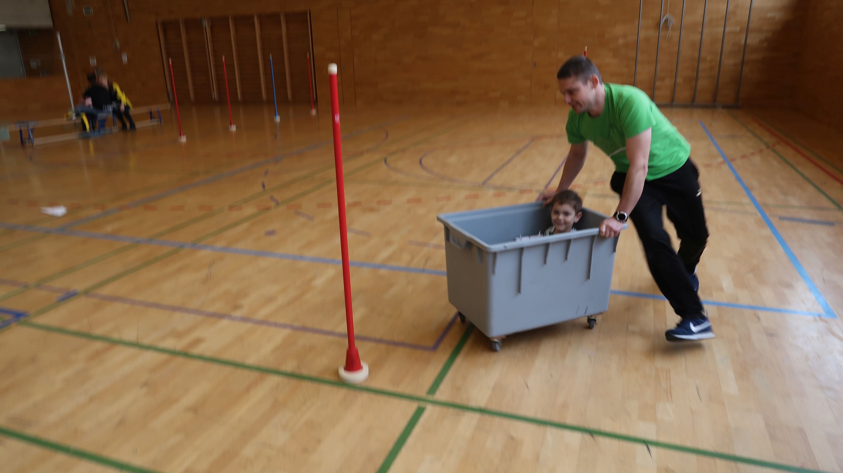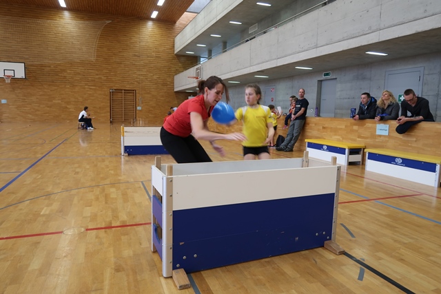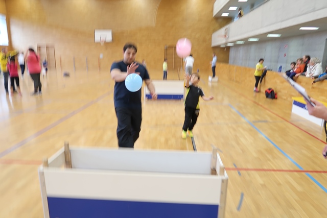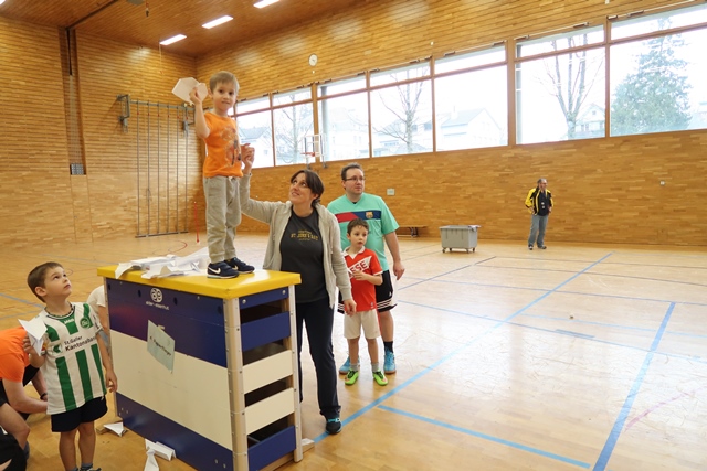 Für einmal waren die Eltern nicht nur als Zuschauer an einem Wettkampf anwesend – sie waren Teil davon. Am MUVAKI-Turnier (Mutter-Vater-Kind) der Jugendriege Rheineck, das am 11. Februar in der Turnhalle Kugelwis stattfand, absolvierten Mamis und Papis, Gottis und Göttis oder sogar Grossmütter und Grossväter mit dem Nachwuchs von Kindergarten- bis Primarschulalter einen Parcours, der Geschicklichkeit und Kondition forderte. Den ganzen Nachmittag übten sich die Zweiergruppen in Seilspringen, Korbwerfen, Papierflieger, Kegeln, Büchsenschiessen, Zwillingsslalom, Wagenrennen und Torschiessen. Nicht selten waren es die Kinder, die mit einem besseren Ergebnis als der Elternteil aufwarten konnten. Was am Schluss zählte, war aber das Gesamtresultat. Aufgeteilt wurden die Teams in drei Kategorien.