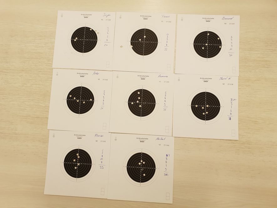Nach diversen Probeschüssen gilt es ernst. Mit 5 scharfen Pfeilen gilt es, ins Schwarze zu treffen. Gleich zwei Mitglieder teilen sich den ersten Platz mit 39 Punkten. (Florian Mäder und Herbert Hess).