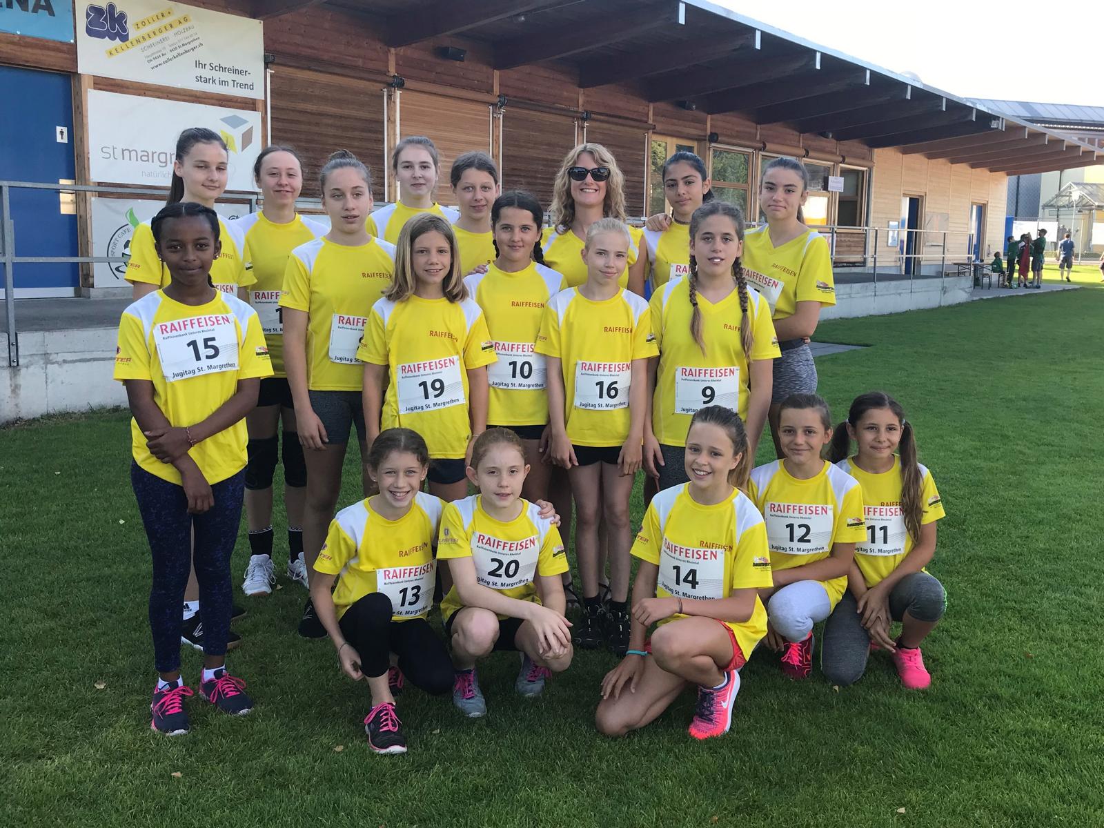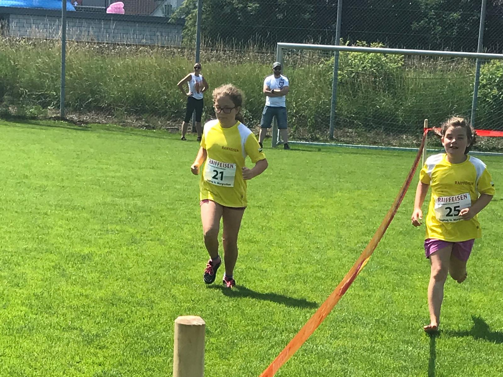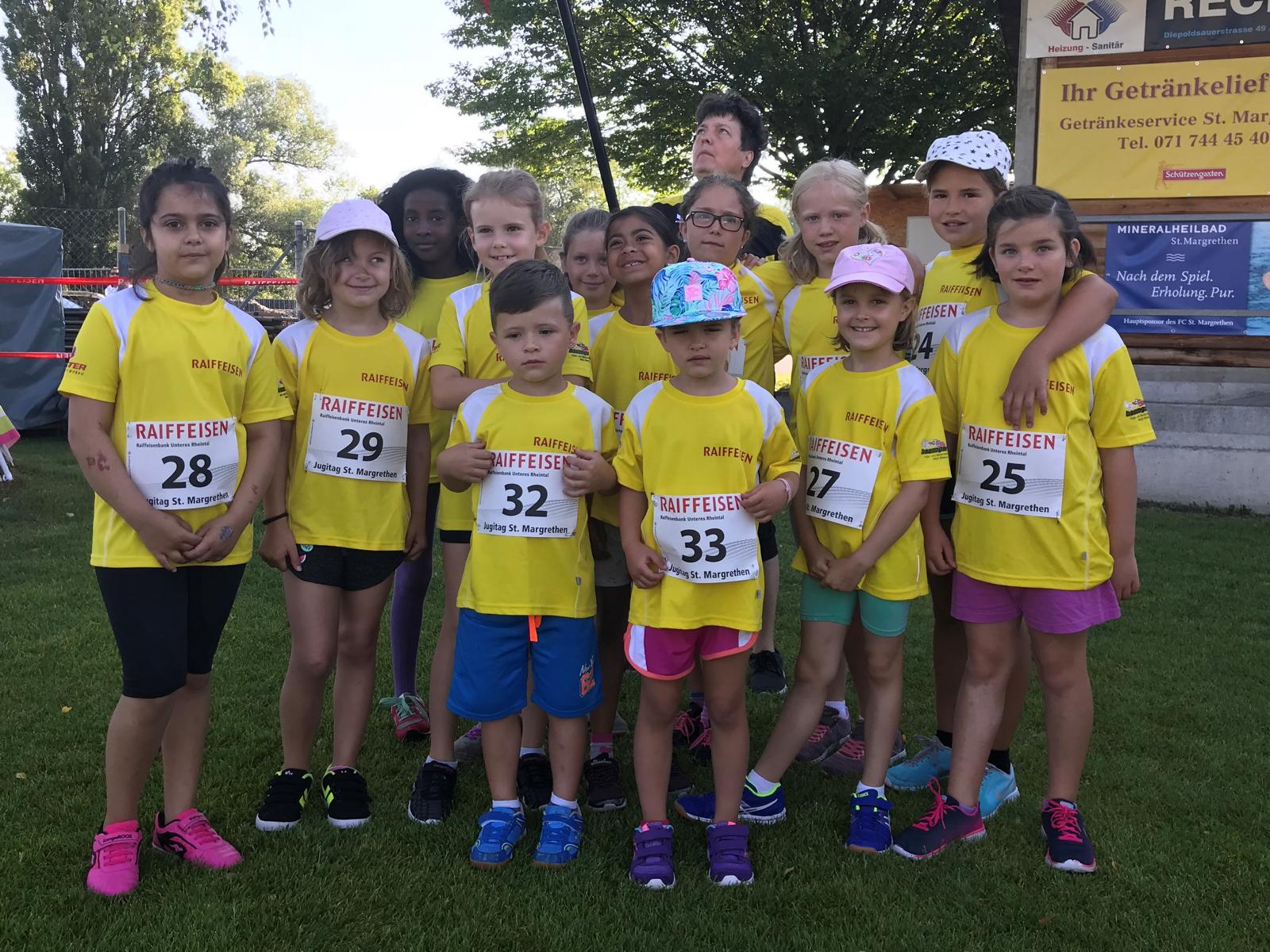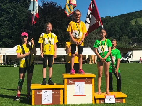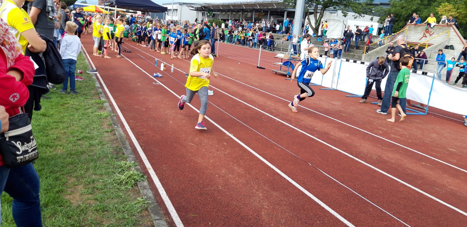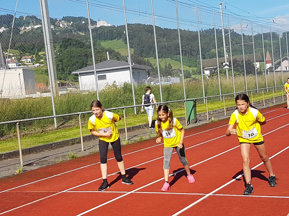 Bereits früh am Sonntagmorgen machten sich 29 Kinder und 4 Leiter mit dem Zug auf den Weg nach St.Margrethen. Motiviert und mit wehender Turnvereinfahne marschierte die Turnerschar vom Bahnhof Richtung Sportplatz. Bei noch angenehmen morgendlichen Temperaturen begann der Wettkampf nach gemeinsamem Einlaufen mit dem Sprint. Weiter bewiesen die 28 Mädchen und ein Junge, ihre Fähigkeiten im Ballwurf/ Kugelstossen und Weitsprung.