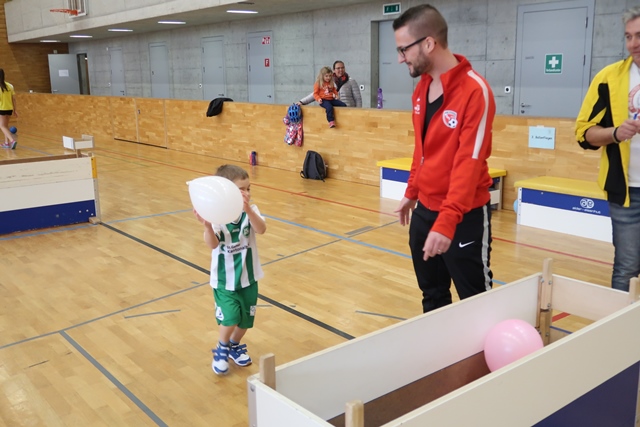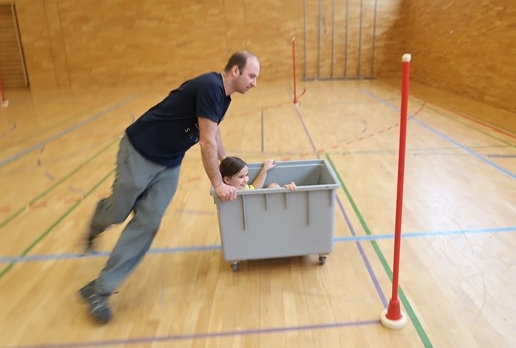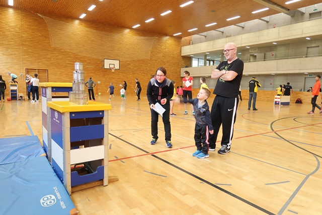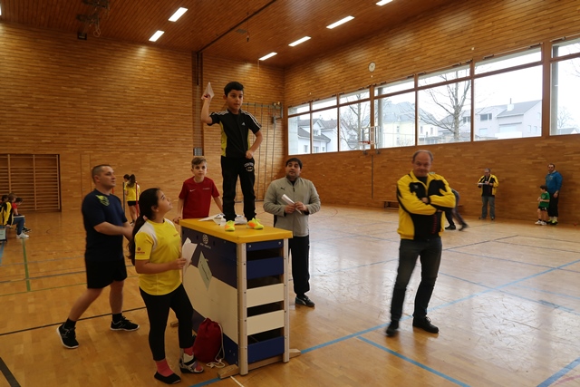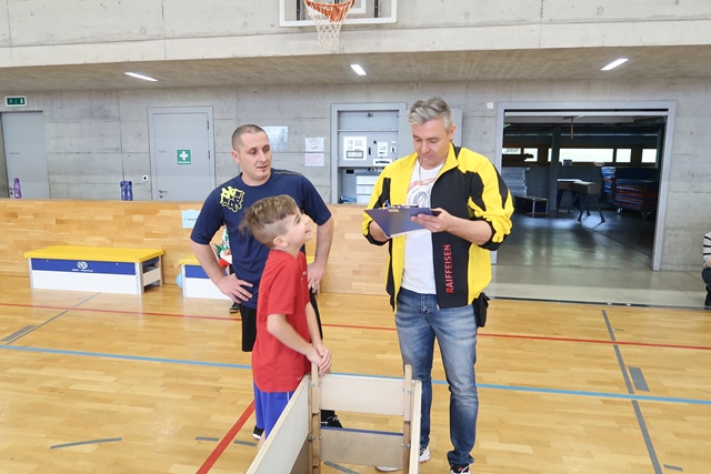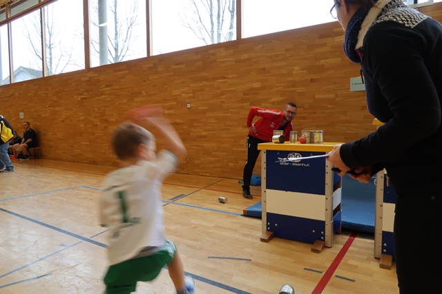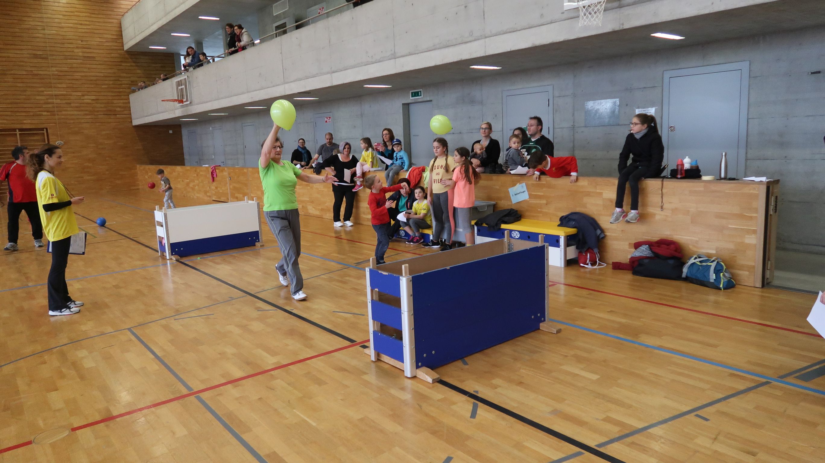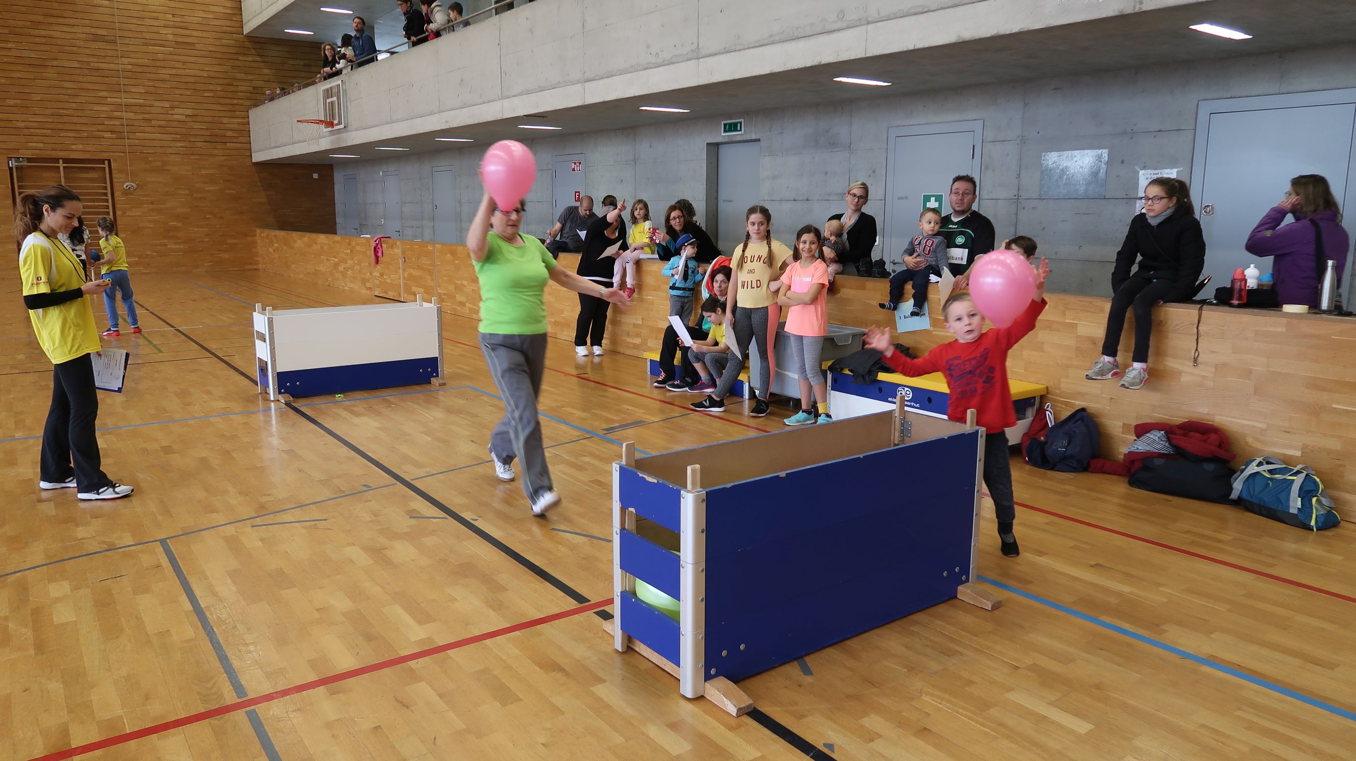 Für einmal waren die Eltern nicht nur als Zuschauer an einem Wettkampf anwesend – sie waren Teil davon. Am MUVAKI-Turnier (Mutter-Vater-Kind) der Jugendriege Rheineck, das am 11. Februar in der Turnhalle Kugelwis stattfand, absolvierten Mamis und Papis, Gottis und Göttis oder sogar Grossmütter und Grossväter mit dem Nachwuchs von Kindergarten- bis Primarschulalter einen Parcours, der Geschicklichkeit und Kondition forderte. Den ganzen Nachmittag übten sich die Zweiergruppen in Seilspringen, Korbwerfen, Papierflieger, Kegeln, Büchsenschiessen, Zwillingsslalom, Wagenrennen und Torschiessen. Nicht selten waren es die Kinder, die mit einem besseren Ergebnis als der Elternteil aufwarten konnten. Was am Schluss zählte, war aber das Gesamtresultat. Aufgeteilt wurden die Teams in drei Kategorien.