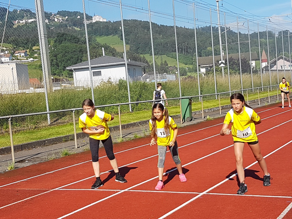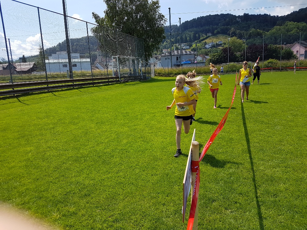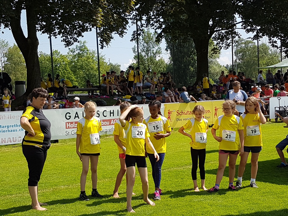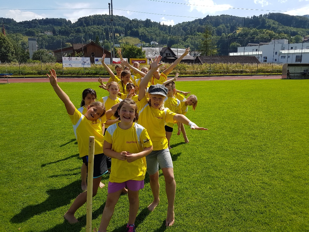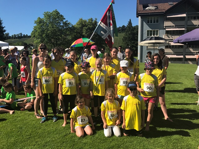 Bereits früh am Sonntagmorgen machten sich 29 Kinder und 4 Leiter mit dem Zug auf den Weg nach St.Margrethen. Motiviert und mit wehender Turnvereinfahne marschierte die Turnerschar vom Bahnhof Richtung Sportplatz. Bei noch angenehmen morgendlichen Temperaturen begann der Wettkampf nach gemeinsamem Einlaufen mit dem Sprint. Weiter bewiesen die 28 Mädchen und ein Junge, ihre Fähigkeiten im Ballwurf/ Kugelstossen und Weitsprung.
