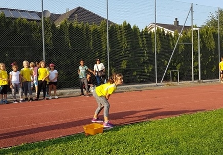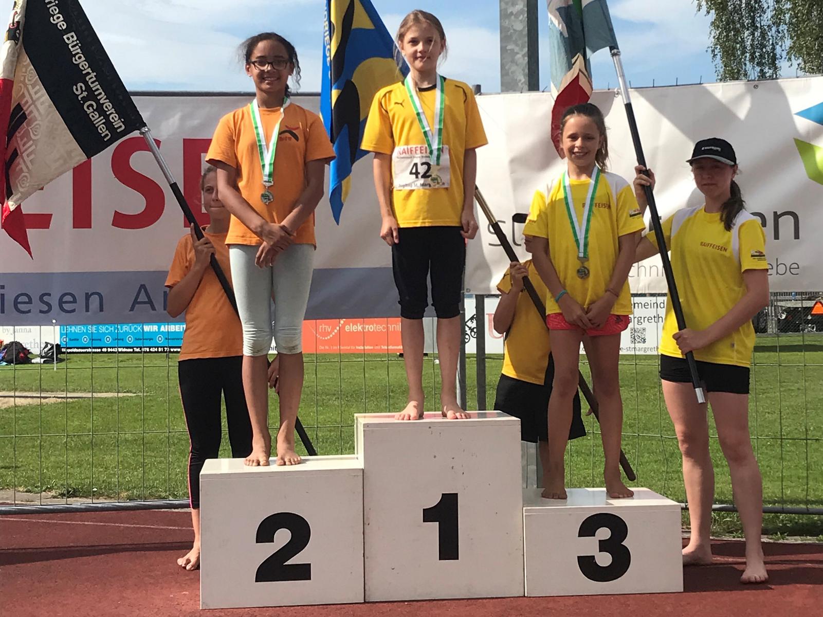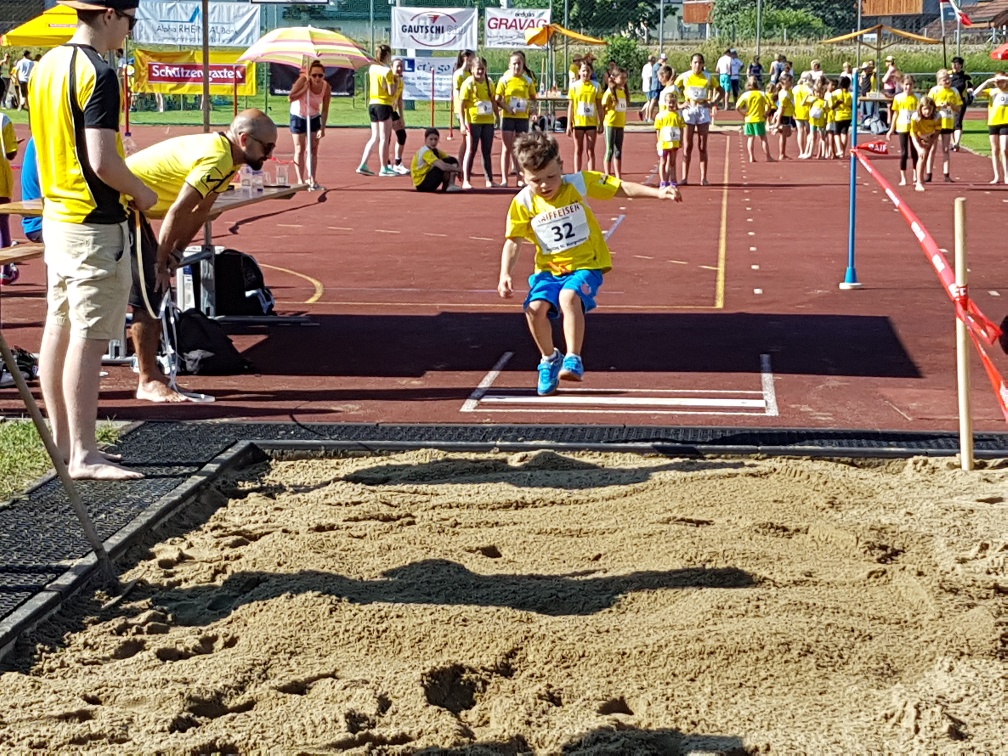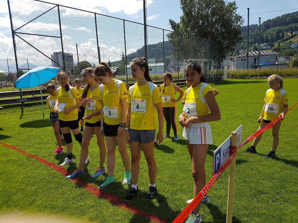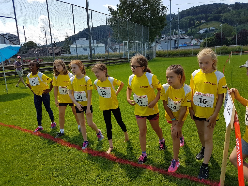 Bereits früh am Sonntagmorgen machten sich 29 Kinder und 4 Leiter mit dem Zug auf den Weg nach St.Margrethen. Motiviert und mit wehender Turnvereinfahne marschierte die Turnerschar vom Bahnhof Richtung Sportplatz. Bei noch angenehmen morgendlichen Temperaturen begann der Wettkampf nach gemeinsamem Einlaufen mit dem Sprint. Weiter bewiesen die 28 Mädchen und ein Junge, ihre Fähigkeiten im Ballwurf/ Kugelstossen und Weitsprung.