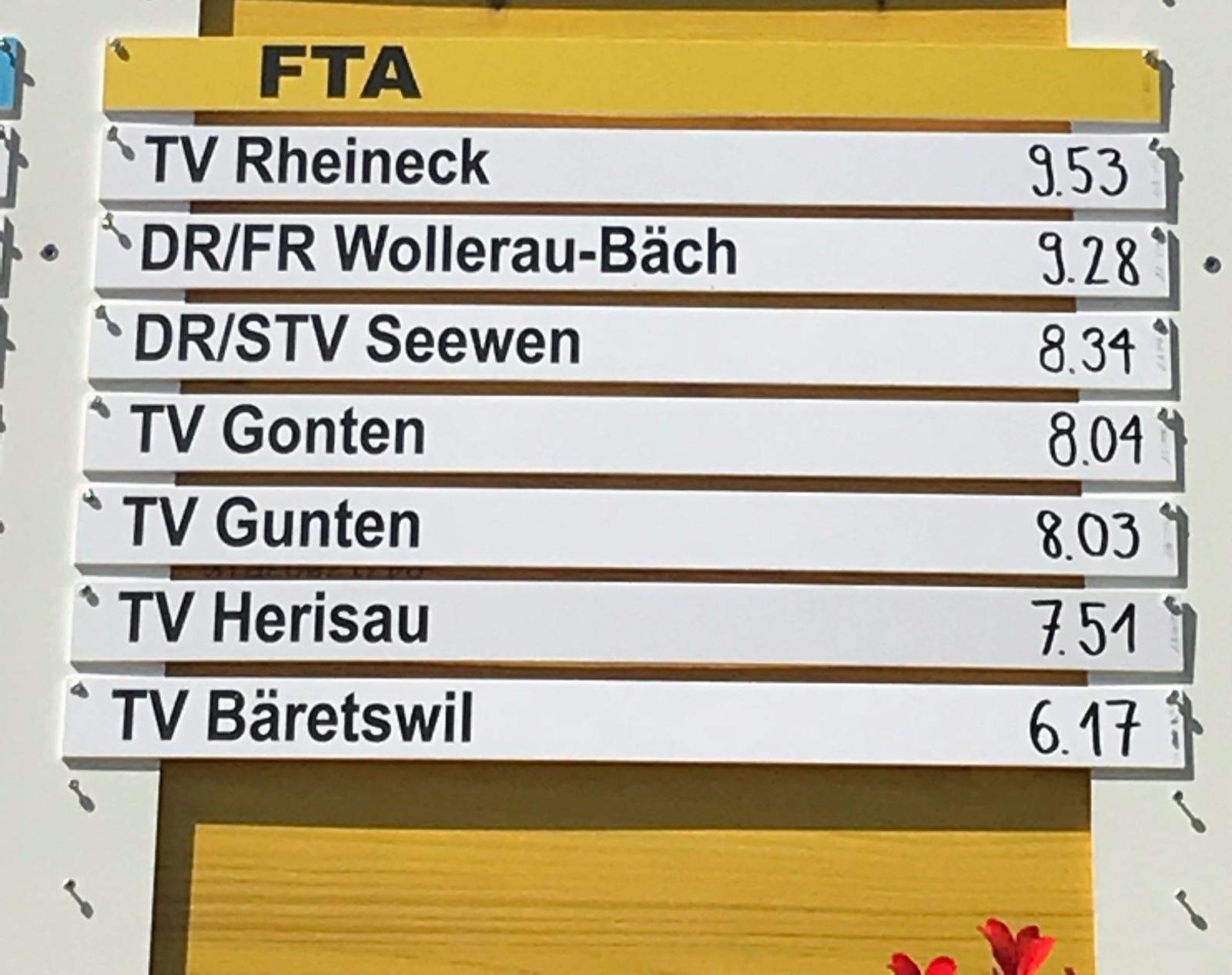 Der STV Rheineck holt sich am Schwyzer Kantonalturnfest den ersten Rang im Fachtest Allround. Mit der starken Note von 9.53 setzten sich die Rheinecker an die Spitze im 1-teiligen Vereinswettkampf.